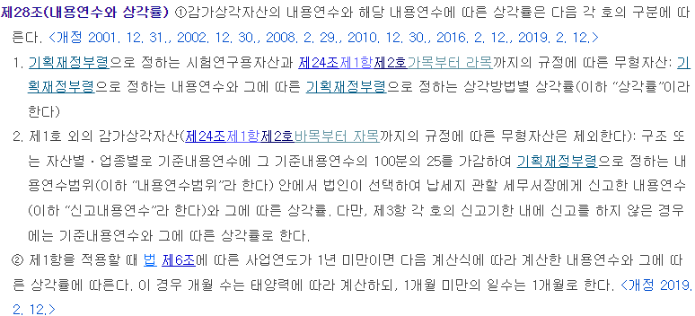 그런데 내용연수가 나와 있지 않아서 찾아보니 법인세법 시행령 28조와 법인세법 시행규칙 제13조의 2(기준내용연수)에서 다루고 있었습니다.