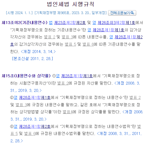 법인세법 시행령에서는 '기획재정부령으로 정하는 내용연수'라고 표현하고 있습니다. 클릭해서 들어가 보면 법인세법 시행규칙 제13조의 2(기준내용연수)이 나옵니다. 볼 때마다 느끼는데 참 법 문구를 편하게 볼 수 있게, 접근성 좋게 잘 만들어놓은 것 같습니다.
