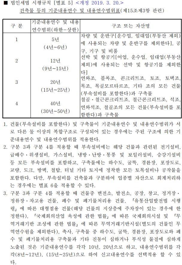 회계, 세무 자산별 내용연수 감가상각비 시부인 건축물 내용연수 예외