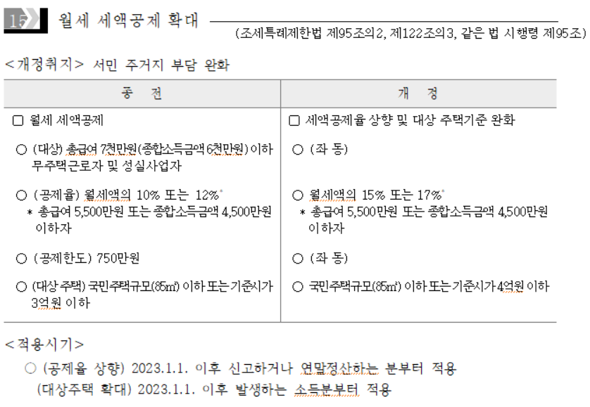 그러나 바뀐 23년부터는 연간 월세액 600만 원 × 15%인 90만 원만큼 세액공제를 받을 수 있습니다.