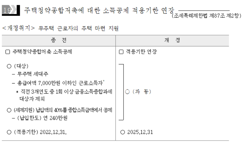 대표적인 소득공제 항목, 전 국민의 소득공제 항목인 주택청약종합저축 납입액 소득공제가 25년까지로 확대되었습니다.