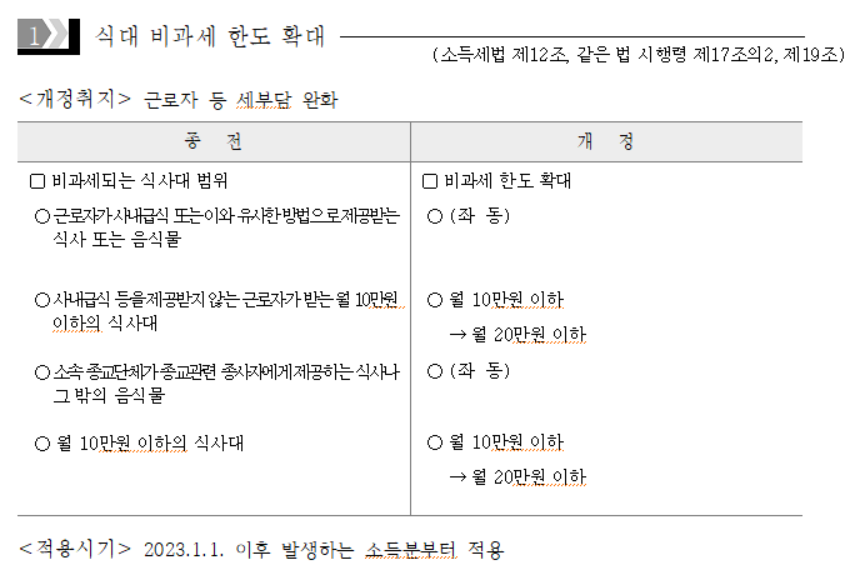 1) 식대 비과세 한도 월 10만 원 → 월 20만 원으로 확대